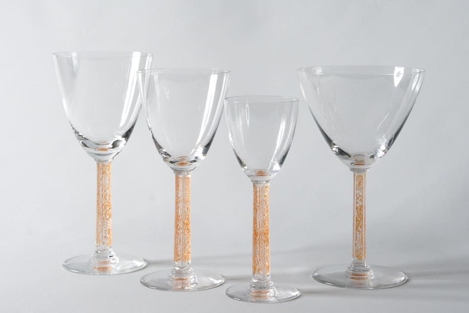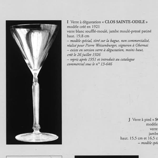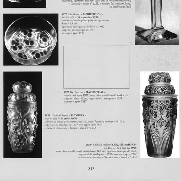 ![]() ![]() 花瓶「ブドウ」1928年 ▷ 作品を見る 花瓶の他、カクテルシェイカー用のケースとしても制作されているユニークな作品です。カタログレゾネを見てみると、シャイカーケース版には蓋も付いていますね。とてもしゃれたアイテムです。 ![]() ![]() ゴブレット「ブドウ」1920年 ▷ 作品を見る 同じく葡萄モチーフのグラスですが、カタログレゾネには「ゴブレット」のページで紹介されています。ゴブレットは、通常のグラスシリーズとは別にワンサイズのみ制作されました。図版には初期の試作品でしょうか?ガラスとは違う素材感の写真も掲載されていますね。 ![]() ![]() テイスティンググラス「聖オディール」1921年 ▷ 作品を見る こちらのグラスはワイナリーの為に特別に作られた記念品で一般販売されていません。カタログレゾネでもオーダー品や高級グラスの特別なカテゴリー「VERRES」で掲載されています。 ![]() ![]() カクテルグラス「エドワード」1924年 ▷ 作品を見る 鶏モチーフのこちらも特別なグラス「VERRES」のカテゴリー。生産数の少ないカクテルグラスで、アール・デコをイメージさせる黒いエナメルで彩られています。 ![]() ![]() カップ&ソーサー「カクタス」1933年 ▷ 作品を見る ラリックのカップ&ソーサーはこの1点しか制作されていません。カタログレゾネを探し回ると「雑貨」その他のページに掲載されています。カクタスとはサボテンの意味で、たしかに棘のような突起がついていますね。 |